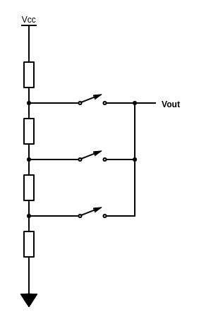 Igal väljavõttel on oma pinge vastavalt sellele kui mitu takistit on temast üleval või allpool. Väga lihtne, aga lülitite ja takistite arv läheb täiesti käest ära kui tahad natukenegi suuremat bittide arvu. Joonisel olev on 2 bitti (4 olekut). Kui tahad 8 bitti tuleb lülitite ja takistite arvuks 254. Lülitid ei ole integraalskeemis mureks, aga takistid võtavad ränil võrdlemisi palju ruumi.