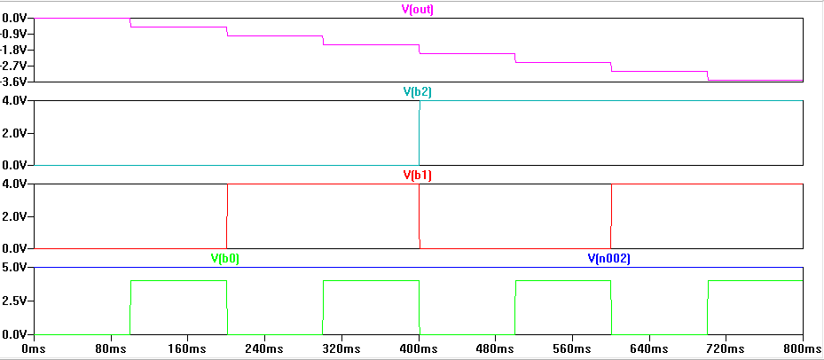 Simulatsiooniks valisin referentspingeks 4V. Seega annavad 3 bitilise muunduri 8 võimaliku olekut ühe sammu suuruseks mugavad 0,5V. Simulatsiooni tulemus on näha alloleval pildil. Sammusin kasvavas järjekorras läbi kõik bittide olekud ja graafikult V(out) võib näha väljundi muutumist.